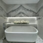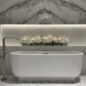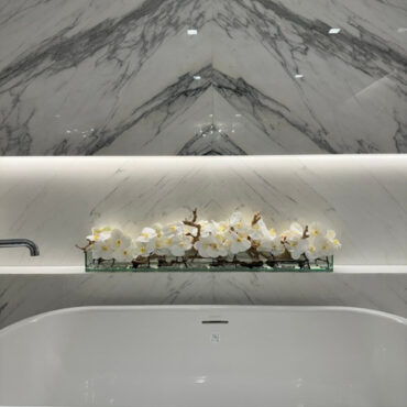 48″ Casa Moderna Glass Plate planter with white Phalaenopsis orchids, sandblasted grape wood, white stones and our illusion water. The stunning sight of a Phalaenopsis orchids in full bloom is nothing less than breathtaking. Their huge, curving petals; double rows of gorgeous blooms march along our casa moderna glass plate planter. This translucent modern glass planter features 90 degree angles and a modern linear design. The sight of a massed display of Phalaenopsis orchids is so arresting that we have paired it with natural sandblasted grape wood to achieve a beautiful and organic contrast.
