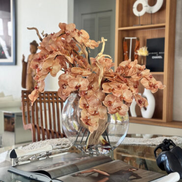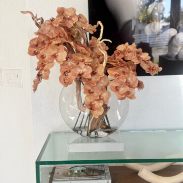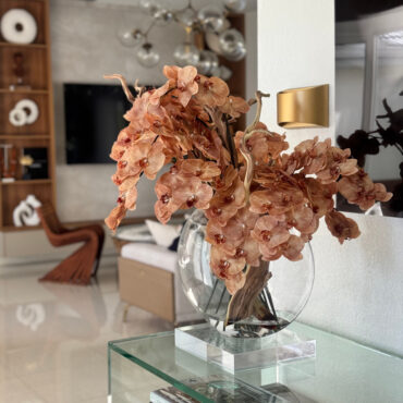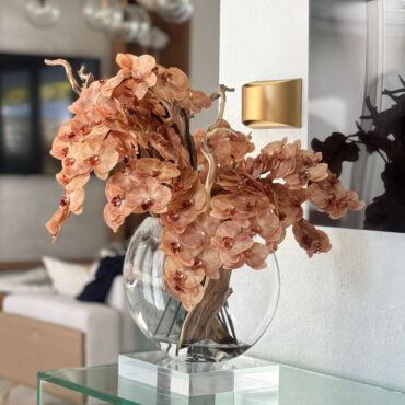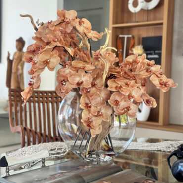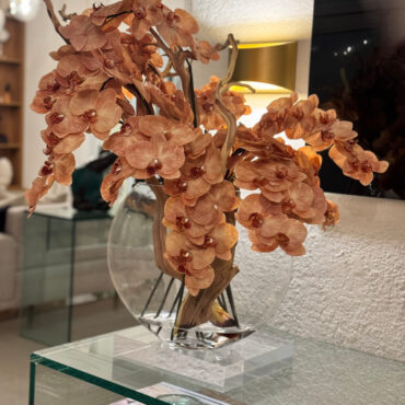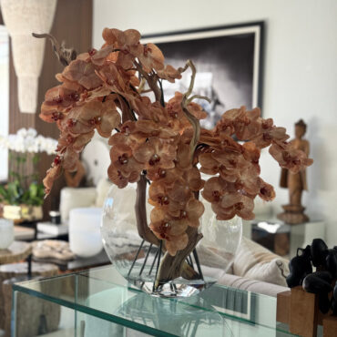 Ths 16″ Glass Moon Vase arrangement features stunning light brown orchids that create a unique and exotic appearance. This elegant design. paired with driftwood, combines warm, natural hues with a glass round vase, making it a sophisticated statement piece for any space. The overall height of the arrangement is approximately 24 inches, with a width 20″ and depth of approximately 10″ inches. Due to the handmade nature of this arrangement, overall dimensions may slightly vary. Placement of flowers may also vary, ensuring each piece is truly one-of-a-kind.