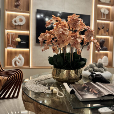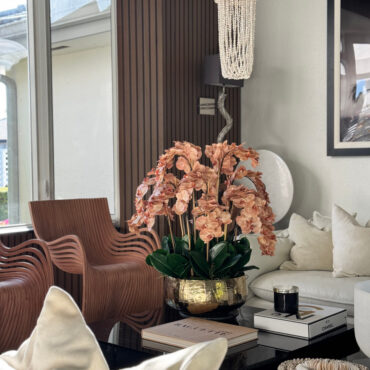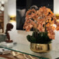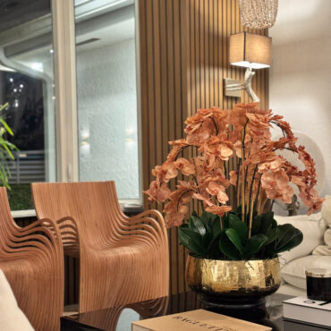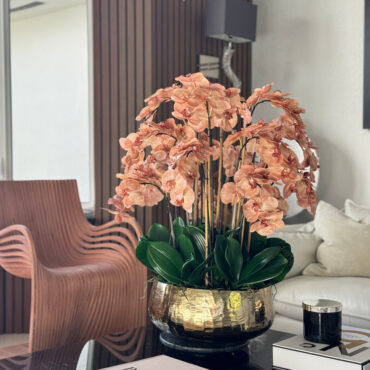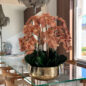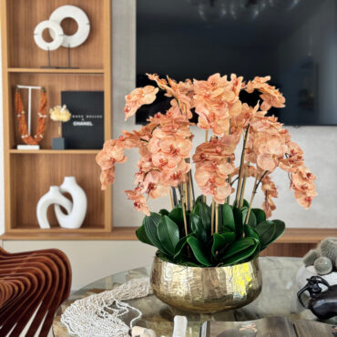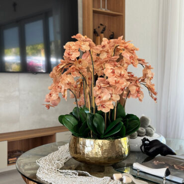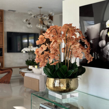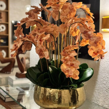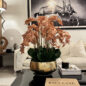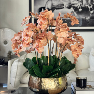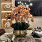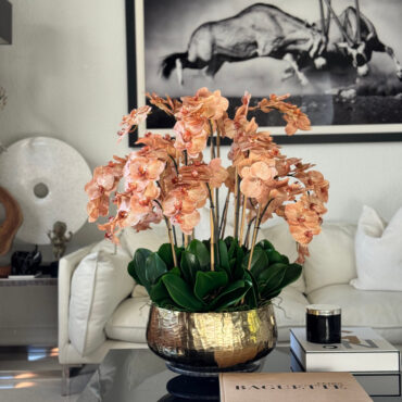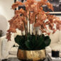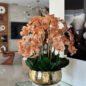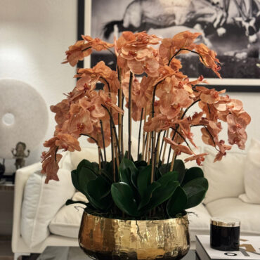 Our Gold Roberi Bowl arrangement features stunning light brown orchids, often showcasing beautiful caramel, honey, and bronze tones that create a unique and exotic appearance. This elegant design combines warm, natural hues with a luxurious gold Roberi bowl, making it a sophisticated statement piece for any space.