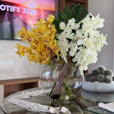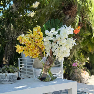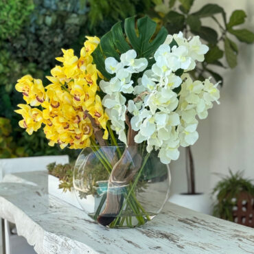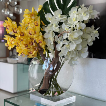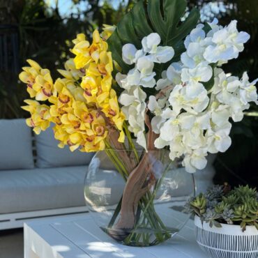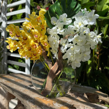Bring the exquisite beauty of Vanda and Cymbidium orchids indoors with this stunning faux floral arrangement that blooms beautifully all year round. Presented in our signature moon vase for a touch of modern elegance, this piece features lifelike orchid stems intertwined with natural California driftwood branches. Each element is artfully anchored in our signature liquid illusion water, creating a hyper-realistic display that captures the serenity and sophistication of nature—without the upkeep.