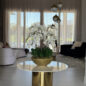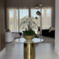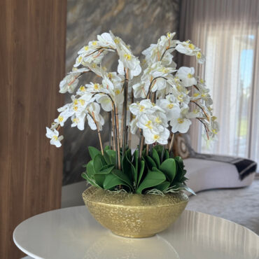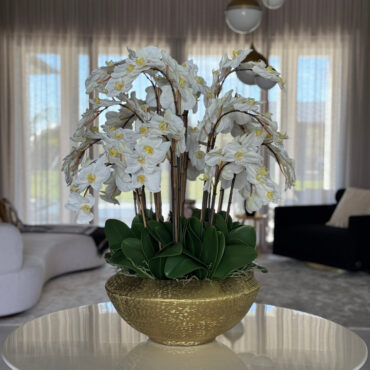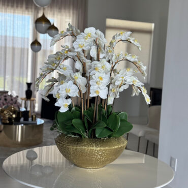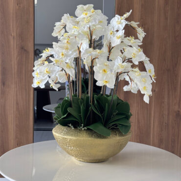 This timeless arrangement features multiple stems of Phalaenopsis orchids, expertly arranged in a sleek, gold Blaze Bowl. Each orchid is securely anchored to a natural bamboo stake, creating a flawless 360-degree display. The lush greenery and foliage of the orchids rest atop a bed of green moss, enhancing the lifelike quality of the artificial blooms. The Blaze Bowl, crafted from gold metal, adds a striking touch to any space. Its hand-carved lines, scattered across the surface in an irregular pattern, create a unique contrast between smooth and textured elements. The rich gold finish is complemented by the texture, while the bowl’s tapered opening and rolled rim make this arrangement the perfect statement piece for a coffee table or centerpiece.