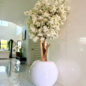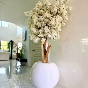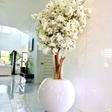 Cherry blossoms are a symbolic flower of the spring, a time of renewal, and the fleeting nature of life. Anchored in our white 30″ globe vase which showcases a basic spherical shape, only with a modern twist. The full globe shape is the quintessential mix of traditional and contemporary styles as the round planters easily compliment any space around the home, garden or office. Its size and shape provide a perfect canvas for a our large white cherry blossom tree. Each tree is a one of a kind, flowers are placed by hand by our skilled artisans onto large wood trunks of California mountain wood. This bouquet of elegant white cherry adds a fresh and stylish touch to any room.